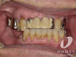 前歯の白い部分が黄色く変色して、なおかつ磨り減ることにより裏側の金属が見えてきている。下の奥歯の入れ歯も磨り減って噛みにくいため、奥歯に力がかからず、顎に負担がかかっている症例。高度で微妙な咬み合わせの治療が必要なため、長期間仮歯と仮入れ歯で調整確認。全体的審美機能回復治療により、改善し痛みなく長期安定。