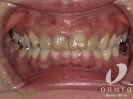 他医院で奥歯を治療し続けた結果、かみ合わせが低くなっている。歯周病も進行している。奥歯のかみ合わせを正常な位置まで高くして、上の前歯6本はオールセラミックで審美機能回復治療。