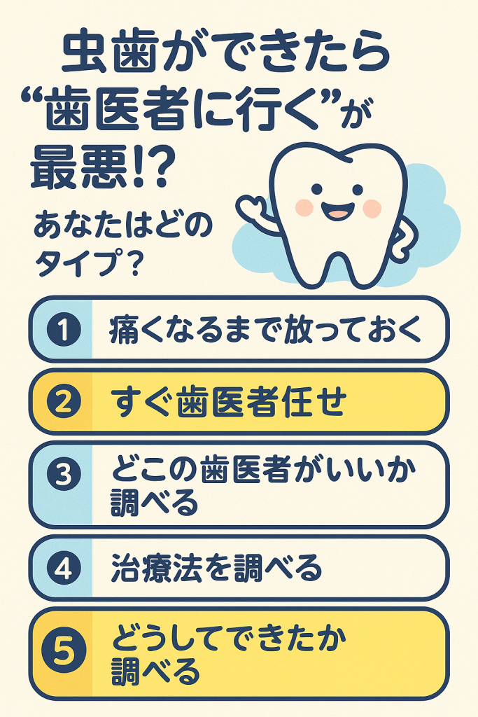 🦷虫歯ができたとき、あなたはどれ? 1️⃣ 痛くなるまで放っておく 2️⃣ スグ歯医者任せにする 3️⃣ どこの歯医者がいいか調べる 4️⃣ 最新の治療法を調べる 5️⃣ どうしてできたのか原因を調べる この中で ②「ス…